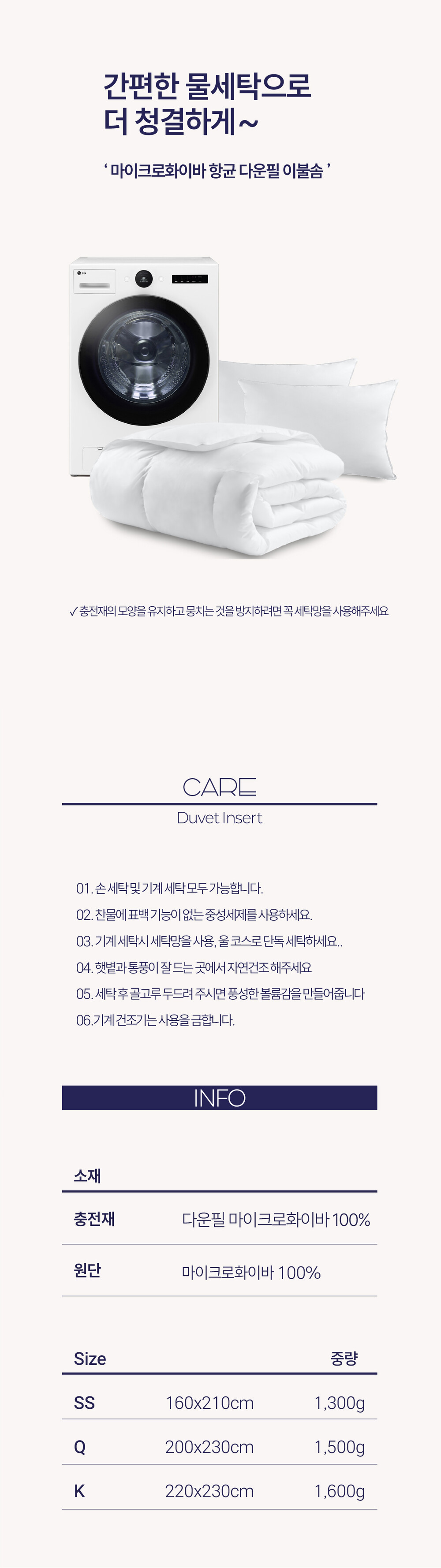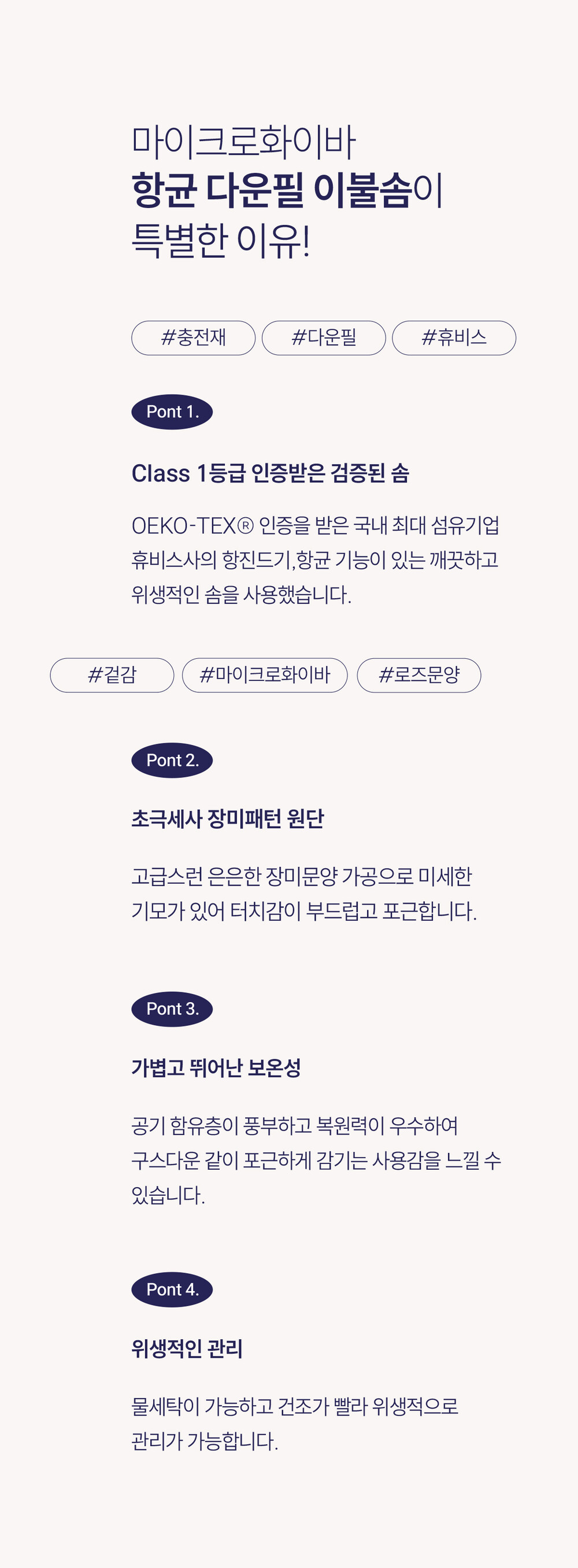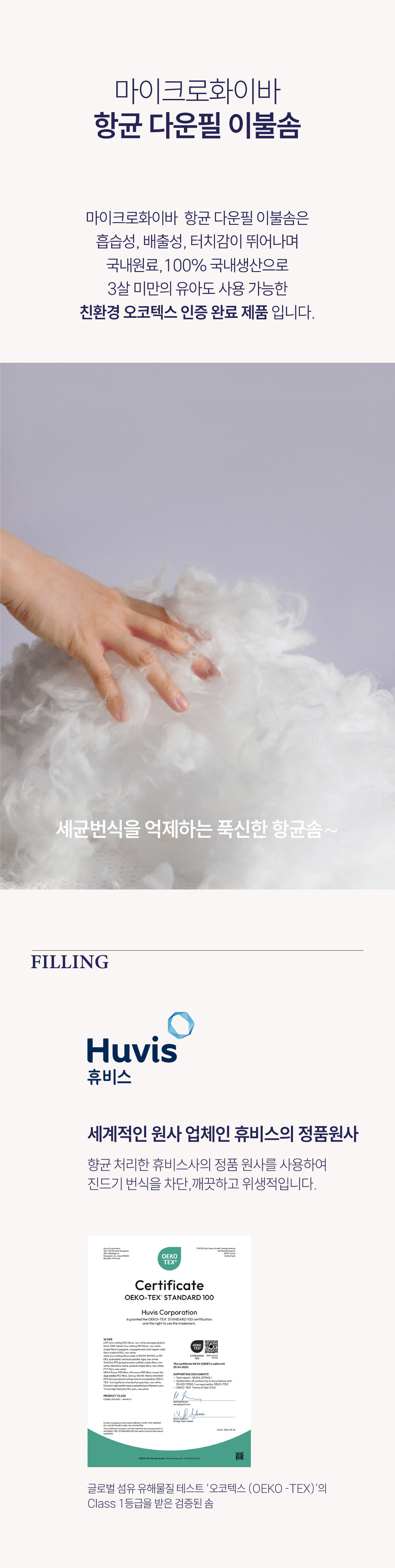 - 마이크로화이바 항균 다운필 이불솜은 흡습성, 배출성, 터치감이 뛰어나며 국내원료,100% 국내생산으로 3살 미만의 유아도 사용 가능한 친환경 오코텍스 인증 완료 제품 입니다.