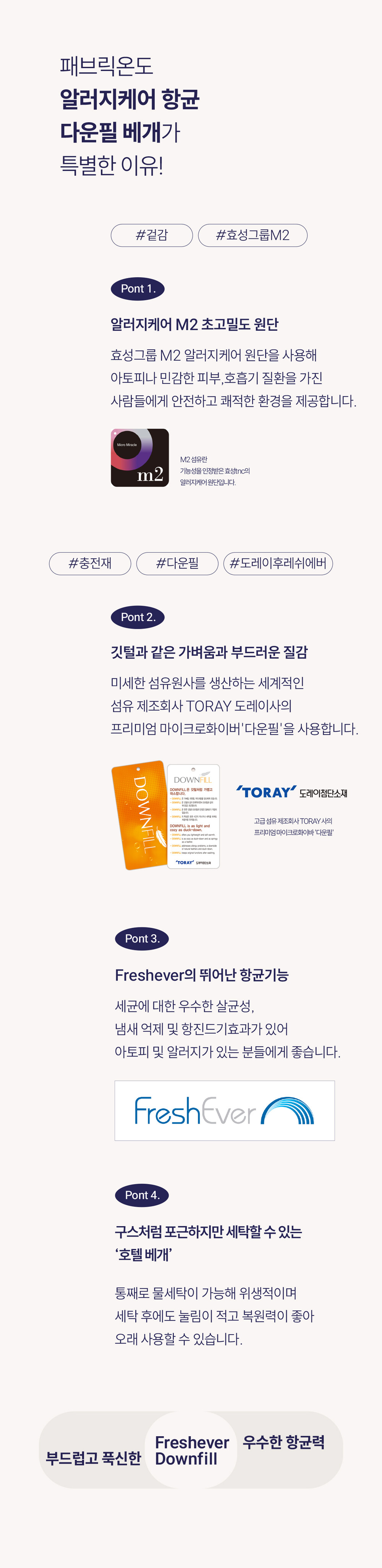 - 아토피나 민감한 피부, 호흡기 질환을 가진 사람들에게 적합하며, 공기는 통과시키면서 진드기와 같은 알러지 유발 요소를 차단하는 뛰어난 기능을 자랑합니다.